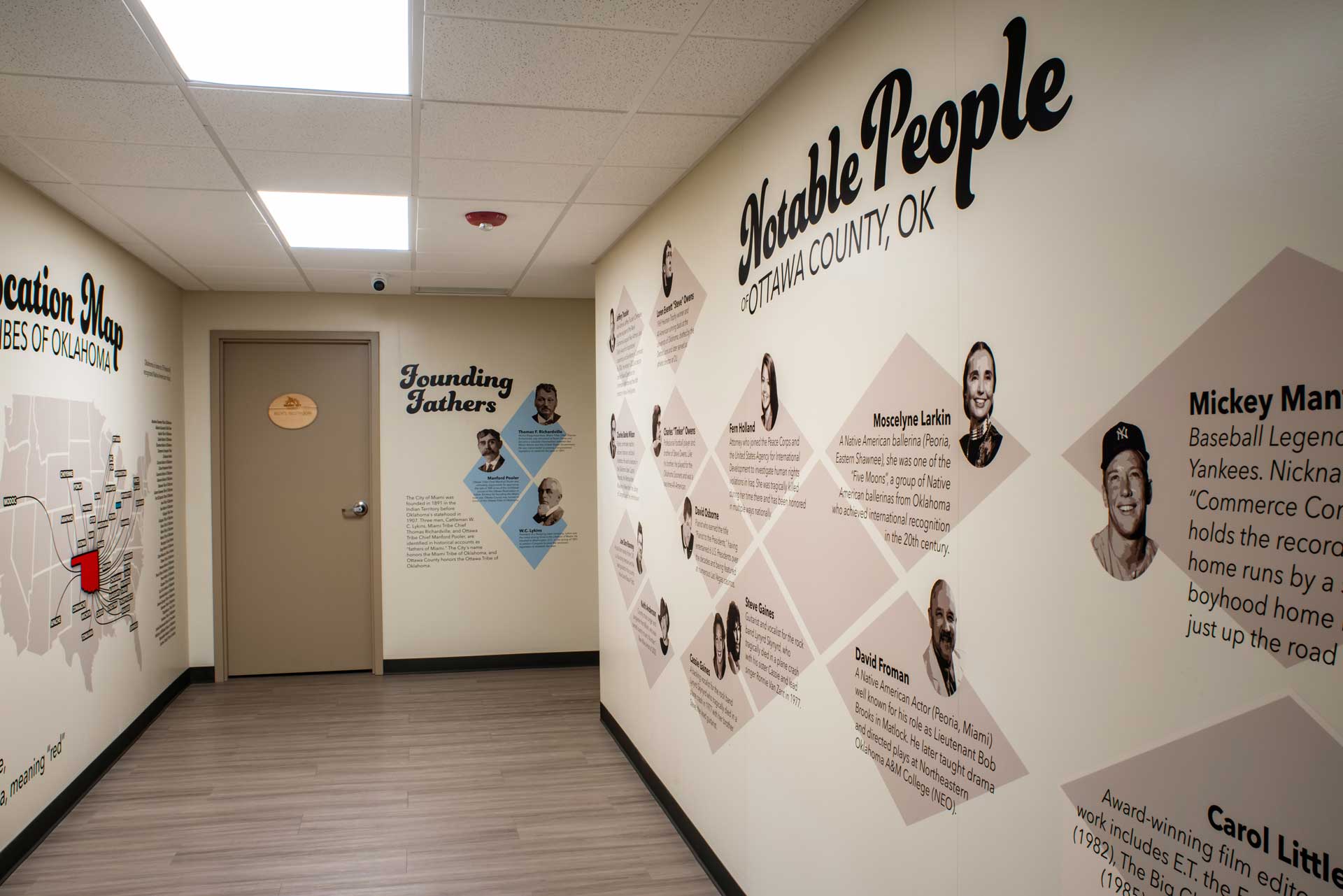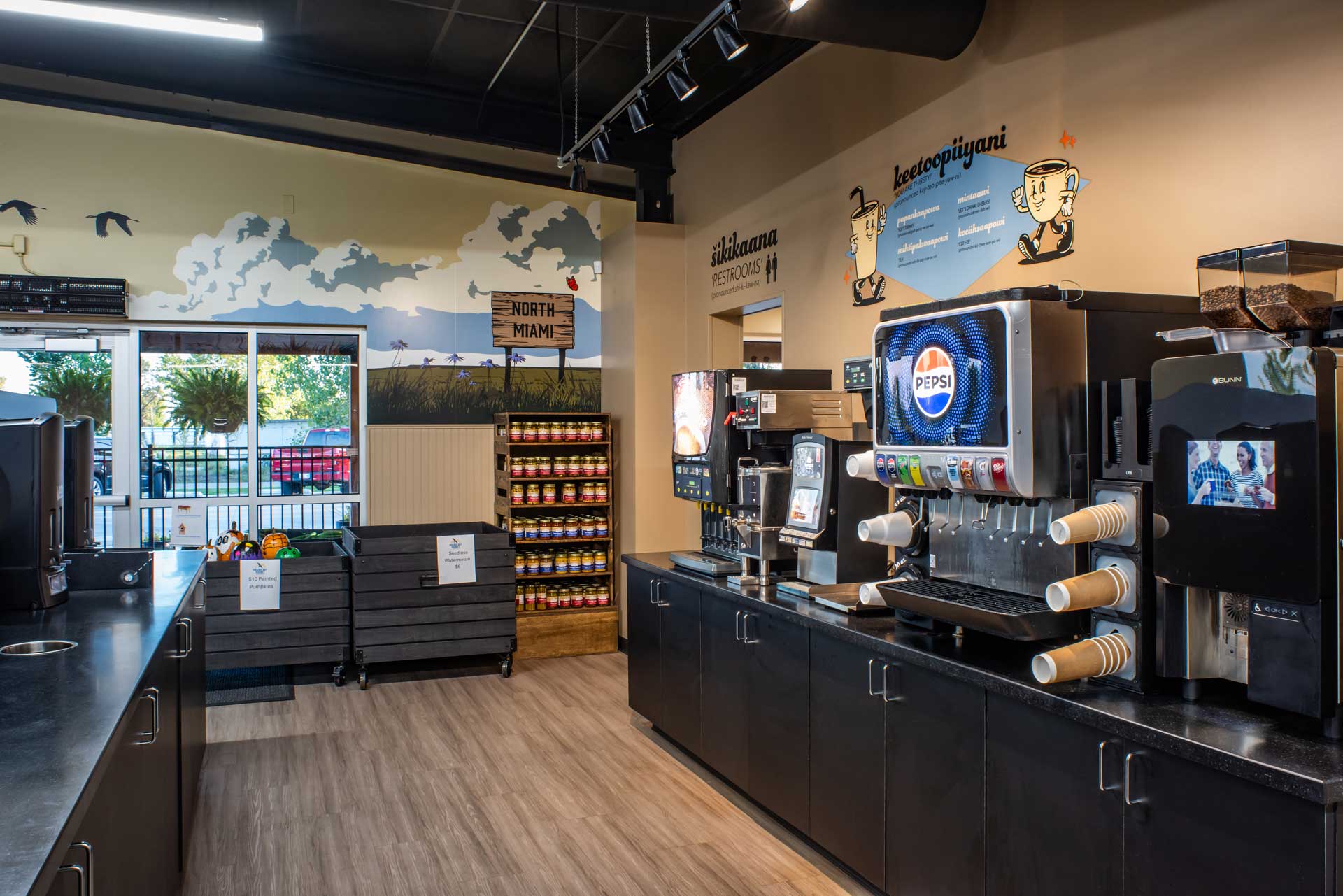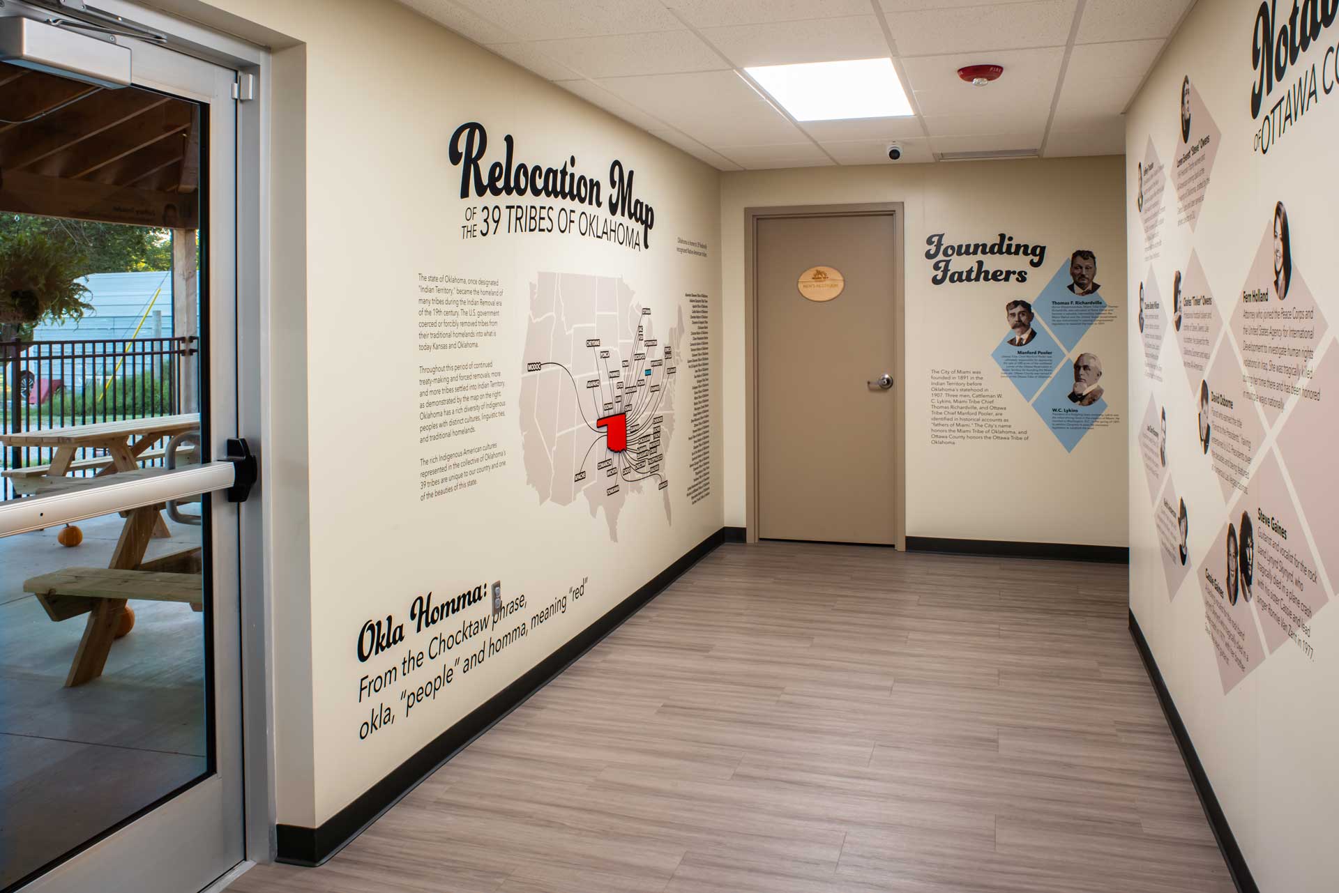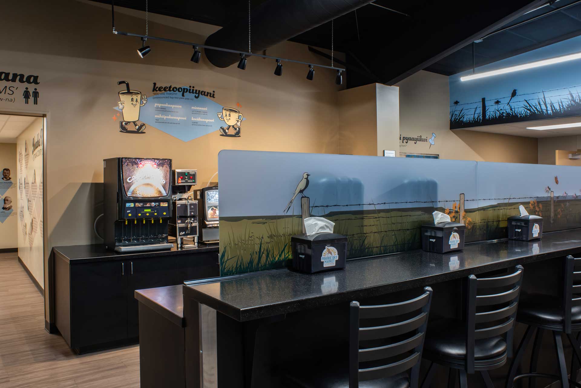 Inside, the space is thoughtfully designed with educational and cultural elements that highlight the Tribe’s history and contributions. Wall graphics, language integration, and storytelling displays provide a welcoming environment that celebrates Native identity while inviting travelers and community members alike.